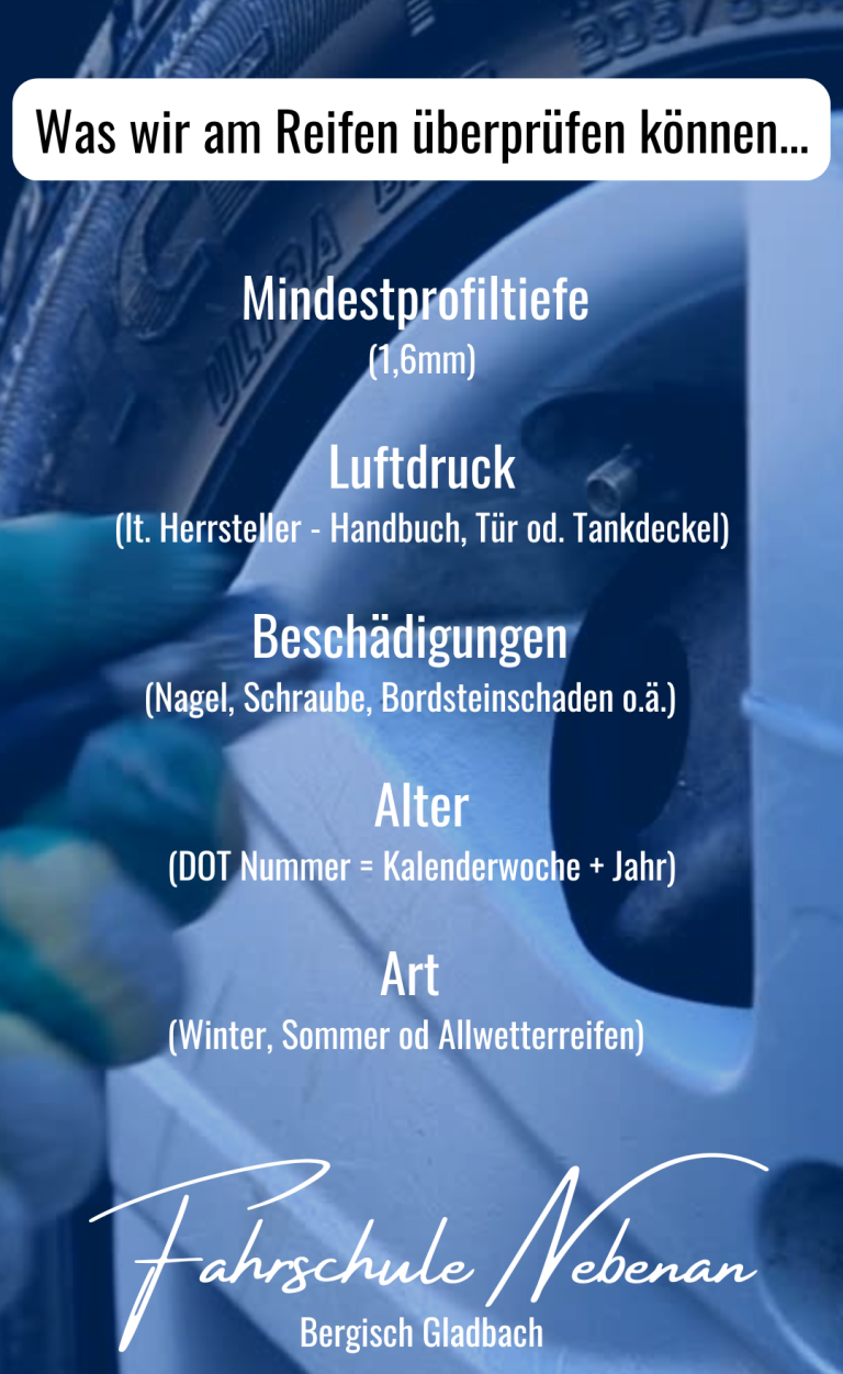 Reifen (Mindestprofiltiefe, Beschädigungen, Luftdruck, Alter)